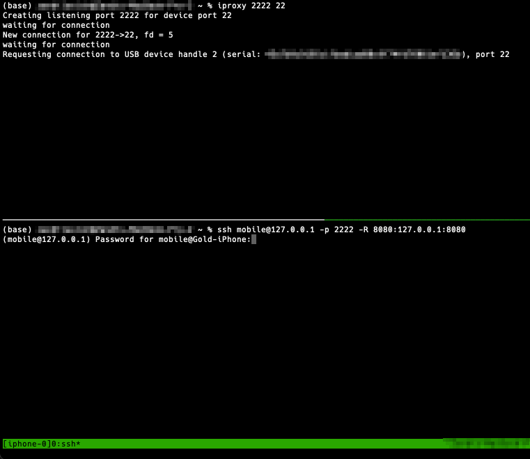Open a second terminal session and connect to the iOS device over SSH. The default username and password (prompted) depend on the jailbreak type (look for documentation). The SSH command we’ll use: